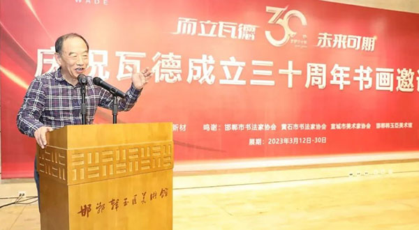 阳光集团董事长韩玉臣作了热情洋溢的致辞,他对瓦德集团成立30年庆典表示热烈地祝贺,对董事长谢富强自身艺术修养及瓦德企业的文化品位给予了很高的评价,对瓦德集团能倾力倾情举办如此规模的书画大展,开创了邯郸书画界先河的行举表示赞叹。