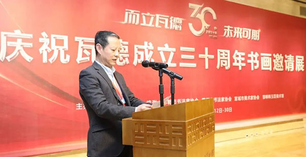 瓦德集团董事长谢富强向与会的各路艺术家及宾朋表达了热情欢迎。向河北邯郸、湖北黄石、安徽宣城三地文联、书协、美协和书画家们的大力支持表达了衷心感谢。尤其对中国知名书画家,邯郸市书协主席,文化名人,著名企业家韩玉臣先生对瓦德集团庆典活动的鼎力支持表达了深深的敬意和由衷地感谢。在三千年历史的赵国都城邯郸,能有瓦德集团如此注重文化艺术的实属难得,能将深厚的中国文化的脉络注入到自己的企业产品中非常难得。