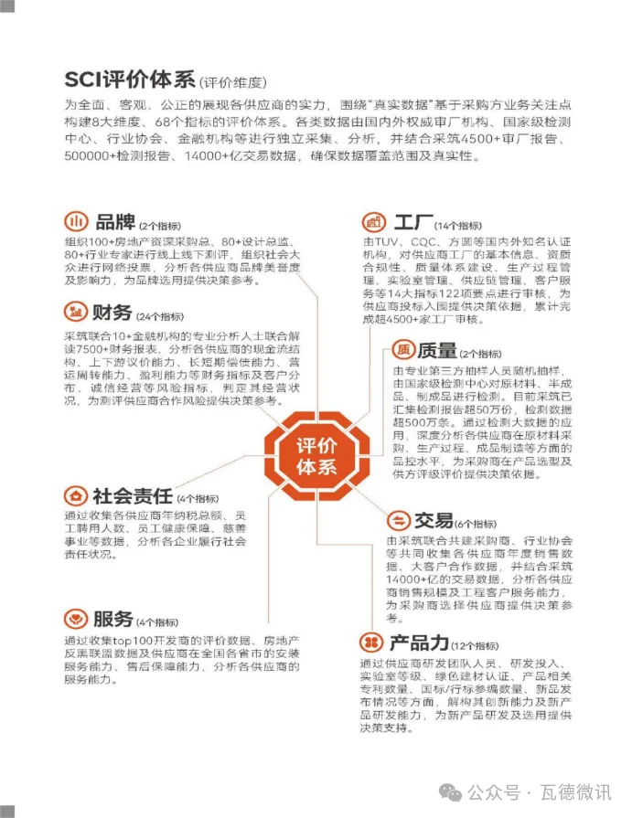 一、SCI两大目的:创建建材行业供应商白名单,精准快速锁定素颜卖方SCI是Supplier Composite Index的简称,即供应商综合指数,指通过对供应商进行全方位的评审,分析企业在经济活动中的表现,反映企业的综合能力及在行业、社会中的相对贡献和地位。采筑联合100+开发商、80+设计机构、15+金融机构、11家国内外权威认证机构、30家国家级检测中心、11家行业协会等成立SCI共建联盟,以专业的视角、严谨的评审体系、庞大的数据基础,围绕“真实.数据”,基于采购方业务关注点,提取工厂、质量、交易、产品力、服务、社会责任、财务、品牌共8大维度68个细分指标对供应商进行全面评价,使用一手数据客观公正输出“SCI”,为行业及用户提供更加真实、专业的数据服务,赋能产业链高质量发展。面向采购商,SCI测评结果将辅助采购商客户准确、快速决策,解决供应商寻源难、寻源成本高、评价难等痛点问题。面向供应商,SCI测评结果协助供应商清晰定位,精准触达商机,并完成交易。