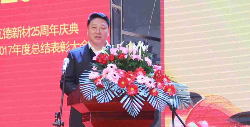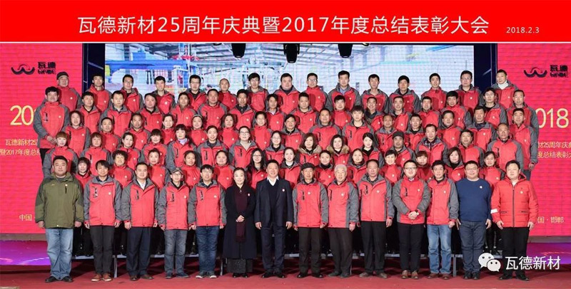 2月3日上午瓦德新材25周年庆典暨2017年度总结表彰大会于河北邯郸五谷丰登大酒店隆重召开。此次会议的主题为“感恩 共享 发展”。集团董事长谢富强,总经理常金秀,中高层领导干部,武汉工厂、邯郸工厂、安徽工厂职工代表,社会各界友人等近300人欢聚一堂, 共同分享收获的喜悦,迎接全新的挑战。